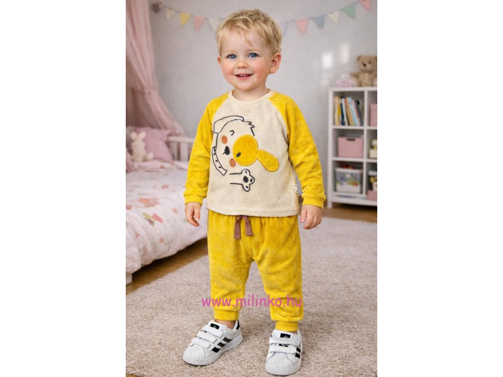Babaruha együttes. Velúrból készült, így nagyon kényelmes viseletet a baba számára. A babakészlet tartalmaz egy pulcsit valamint egy gumírozott derékkal rendelkező nadrágot. A baba szett alkalmas szabadidős viseletnek, otthoni viseletnek, de alkalmas sétáltatásra, játszótérre, parkba is.