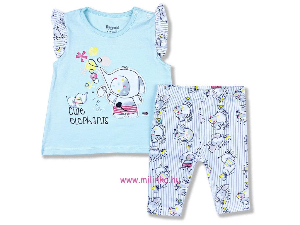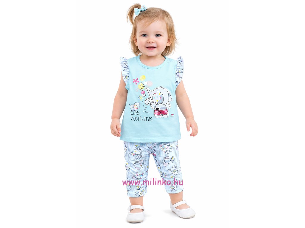 2 részes babaszett mintával. A bébi ruhaszett egy fodros ujjú tunikából és 3/4-es leggingből áll. A tunikát mesebeli elefántos minta és a „Cute Elephants” – „Aranyos elefántok” felirat díszíti. A legging dereka gumis, elefántos mintával díszített. Minőségi babaruházat.