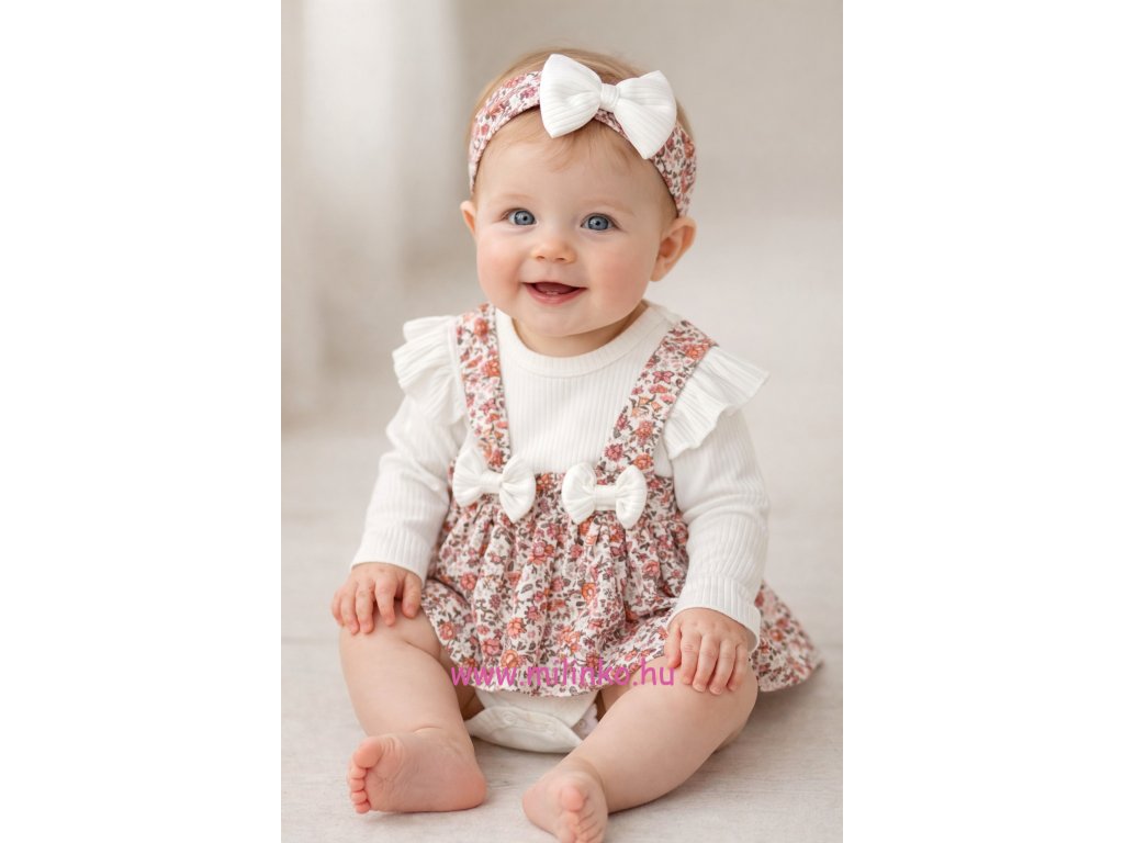 A babaszett egy bodyt, fejpántot és egy kantáros szoknyát tartalmaz. Egyedi ruhadarab kis hercegnőinknek. Anyag: 100% pamut.