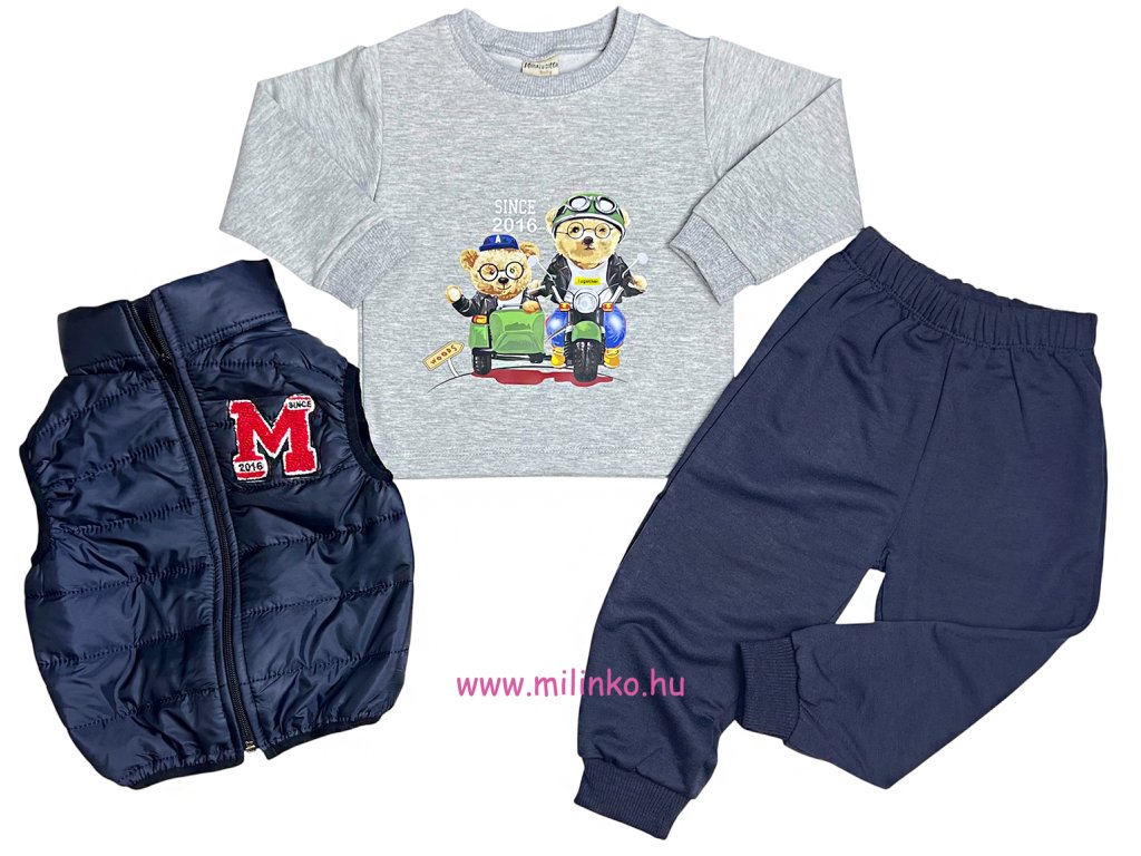 Fiús babaruha szett, amely tökéletes átmeneti öltözet őszi vagy tavaszi időszakra. A szett tartalmaz egy meleg, bélelt mellényt cipzáros rögzítéssel, egy hosszú ujjú, feliratos pólót, valamint egy babanadrágot. A babaszett ideális szabadidős viseletként, otthoni öltözetként, de kiváló választás sétához, játszótérre vagy parkba is.