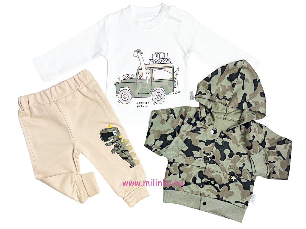 3részes kényelmes szett kislányoknak. A szett tartalmaz egy patentos melegítőfelsőt kapucnival, gumírozott derekú nadrágot valamint egy hosszú újjú pólót. Divatos minőségi babaruha olcsón.