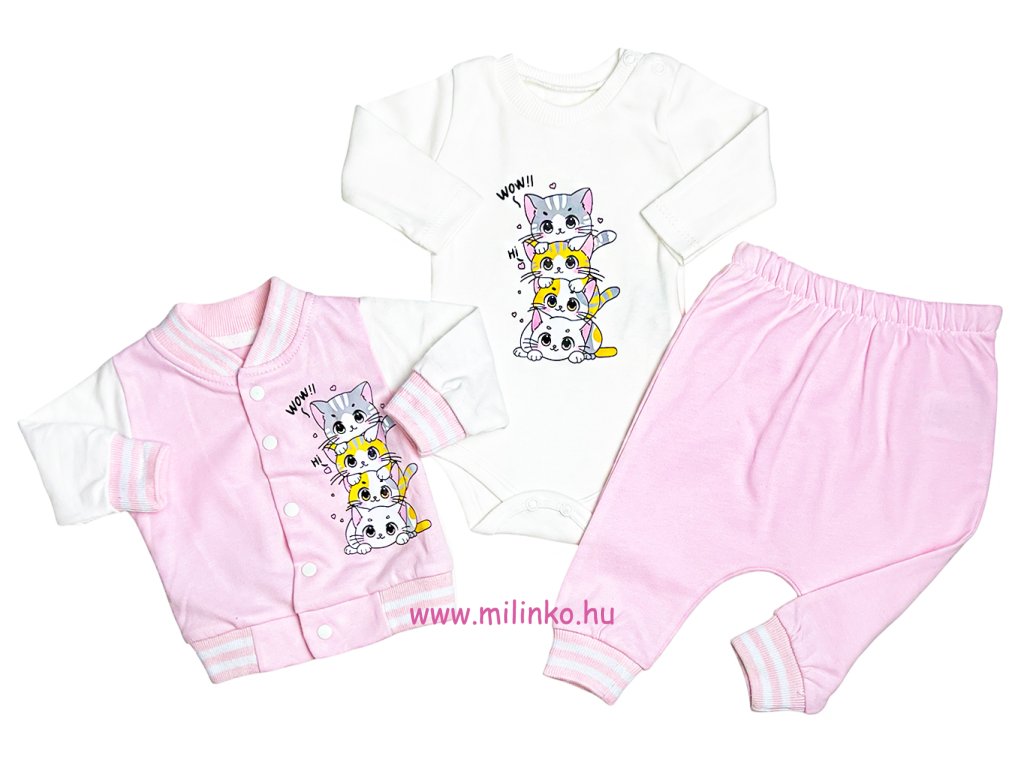 3részes babaruha szett- Macskás, vil. rózsaszín