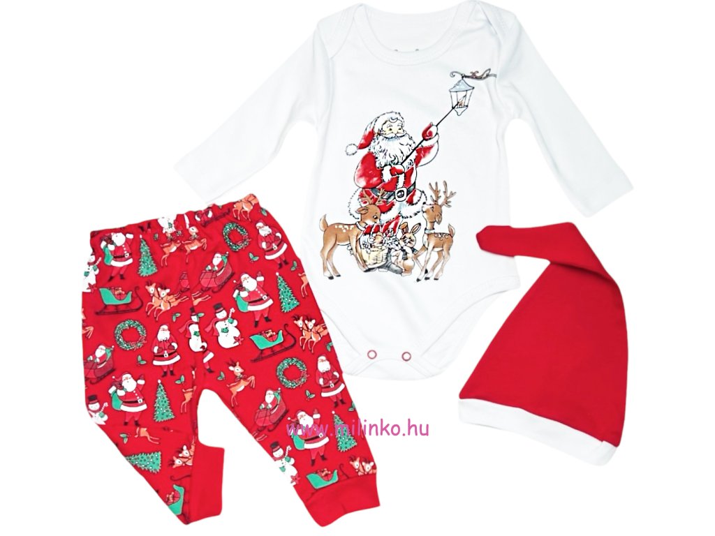 Ez a 3részes szett hosszú ujjú bodyból, melegített nadrágból és egy Mikulás sapkából áll.