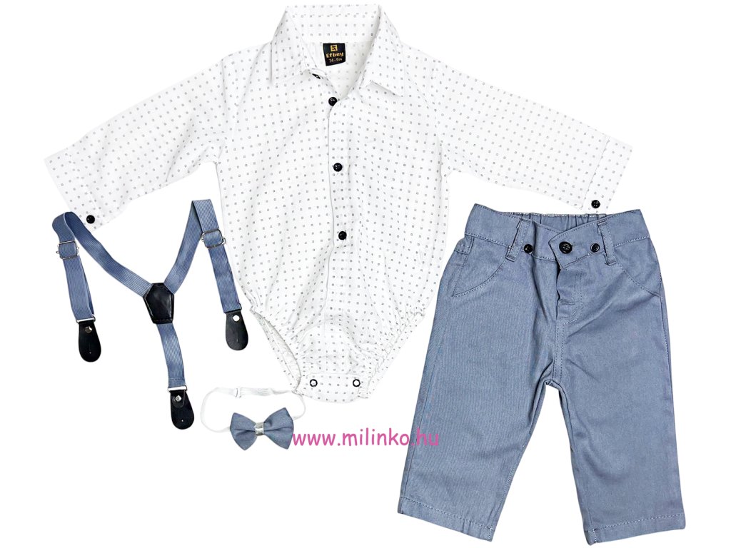 4részes elegáns babaruha keresztelőre vagy ünnepélyes alkalmakra. A babaruha szett egy ingből, nadrágból, gumis csokornyakkendőből és kantárból áll. Az ing elöl gombos, a nadrág gombra és cipzárra záródik. Az egész szett tökéletesen össze van hangolva színileg. Minőségi babaruha olcsón.