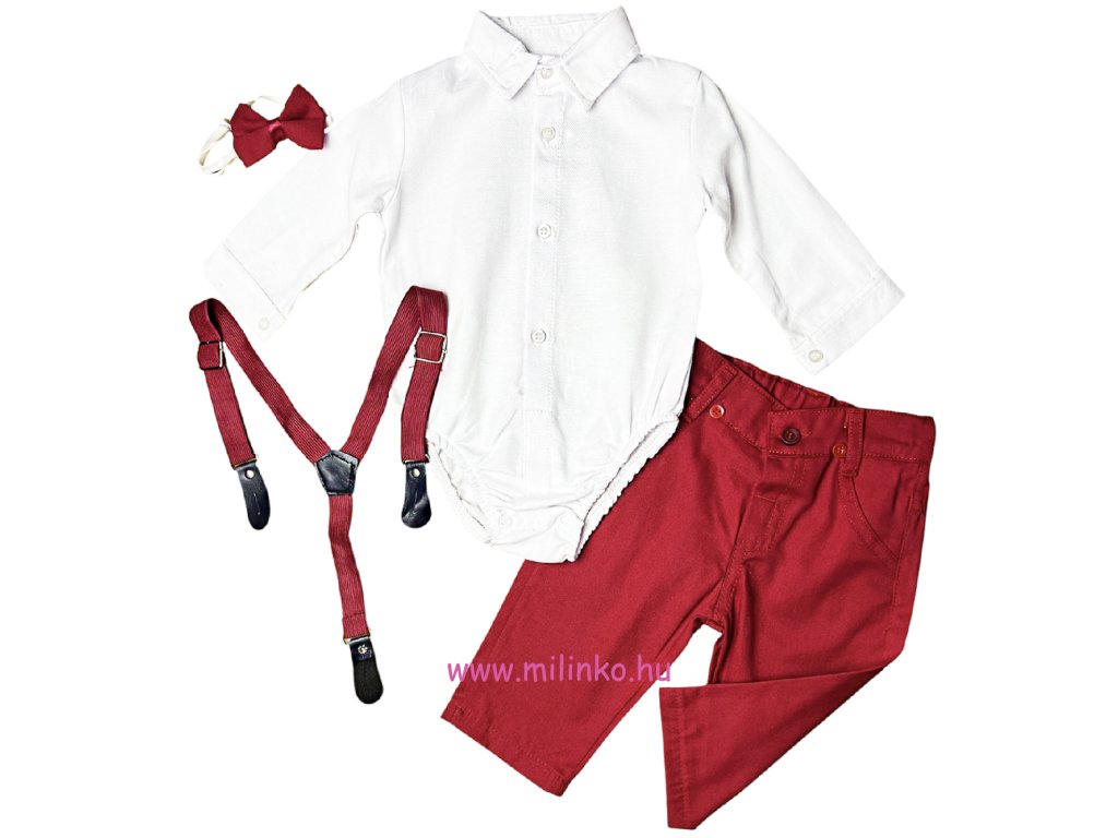 4részes elegáns babaruha keresztelőre vagy ünnepélyes alkalmakra. A babaruha szett egy ingből, nadrágból, gumis csokornyakkendőből és kantárból áll. Az ing elöl gombos, a nadrág gombra és cipzárra záródik. Az egész szett tökéletesen össze van hangolva színileg. Minőségi babaruha olcsón.