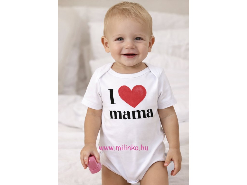 A baba kombidressz a legfontosabb darabja minden baba gardróbjának. Gyerek és baba body 100% pamutból. A baba kombidressz egy alapdarab,egy olyan ruhadarab amelyet a babád szinte minden nap visel, ezért méretenként több darabra is szükséged lesz. Kényelmes viselet a legkisebbeknek. Babád mindig komfortosan érzi majd magát benne és neked sem kell izgulnod, hogy az izgő-mozgó csöppségednek épp kint van a dereka, mivel a body védi őt a megfázástól. A kényelem és a kiváló anyagminőség mellett a design sem másodrangú tényező. Ez a baba body egy felirattal van díszítve: I love mama- Szeretem anyát. Kedves kis felirat, aranyos gyerek és baba bodyk, kombidresszek.